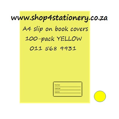 Yellow A4 Slip on Book Covers. Pack of 100. A4 Fitted Yellow Plastic Book Covers, 60-75mic. (colour dot on picture represents the shade of colour). Supplied in advertised colour. Without additional print on plastic, Name block location might differ on cover.