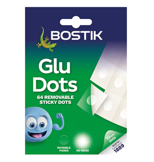 64-Pack Bostik Removable clear glue dots. Double sided glue dots. Instant fixing. Sticks to paper, wood, plastic, metal & glass.