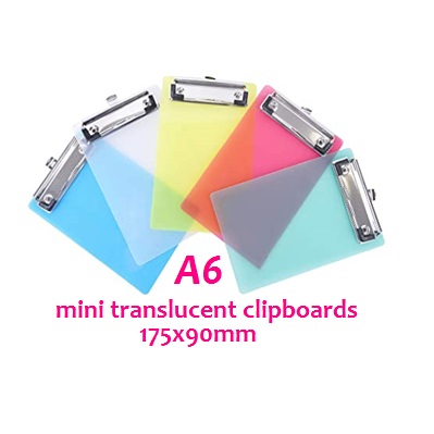 A6 Size Transparent Clipboard With Metal Clip. Single Clipboard. Size: 175x90mm. Handheld size. Available in translucent colours, blue/green/red/clear/yellow. Sizes listed are are an estimated guideline.