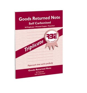 RBE Goods Returned Pad A5 Triplicate (F0560). RBE’s GOODS RETURN NOTE is the ideal pad used to keep track of all items returned to you by a customer, or even from you to a supplier. This versatile A5 duplicate pad is neat, easy to use and professional.