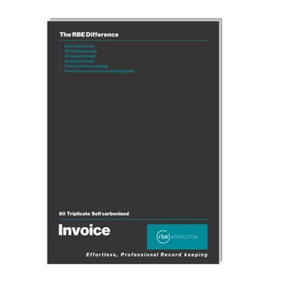 RBE INVOICE pads are carbonless pads, bound at the head, containing 50 sets of printed triplicates, available in A5 or 148mm x 210mm books, have a write shield attached to slide in between sets.