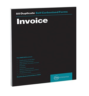 RBE INVOICE pads are carbonless pads, bound at the head, containing 50 sets of printed duplicates available in A5/148x210mm books, have a write shield attached to slide in between sets. 50 self carbonised duplicate sets per pad