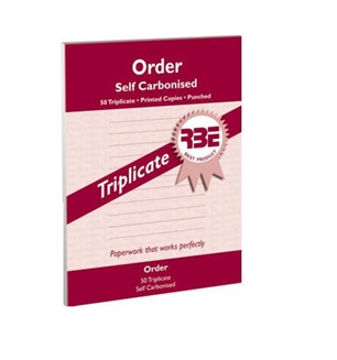 RBE PURCHASE ORDER pads are carbonless pads, bound at the head, containing 50 sets of printed triplicates, available in A5 or 148mm x 210mm books, have a write shield attached to slide in between sets.