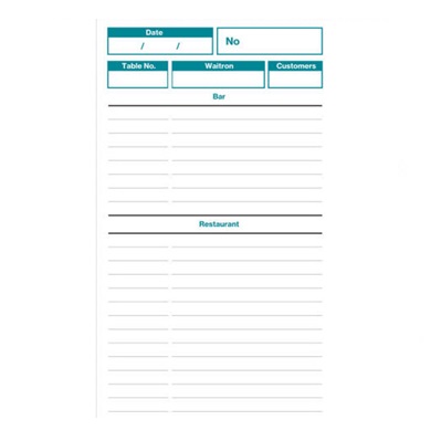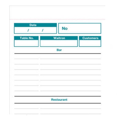 Triplicate RESTAURANT & BAR ORDER PAD, includes food and drinks order on 1 sheet.