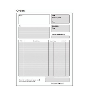RBE A5 Duplicate Purchase Order Pad F0096. RBE PURCHASE ORDER pads are carbonless pads, bound at the head, containing 50 sets of printed duplicates available in A5 or 148mm x 210mm books, have a write shield attached to slide in between sets.