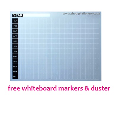 Cast Acrylic Year planner, 600x450mm. Write & wipe surface. Non-magnetic. includes 4-pack whiteboard markers & duster. Slimline (3mm thickness), lightweight design, frameless, mounted with double sided tape (included).